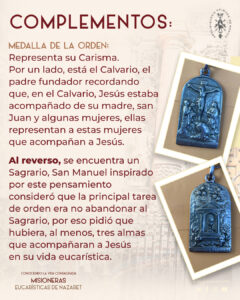 La Medalla representa su Carisma. Por un lado, está el Calvario, el padre fundador recordando que, en el Calvario, Jesús estaba acompañado de su madre, san Juan y algunas mujeres, ellas representan a estas mujeres que acompañan a Jesús.