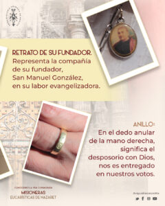 Representa la compañía de su fundador, San Manuel González, en su labor evangelizadora.