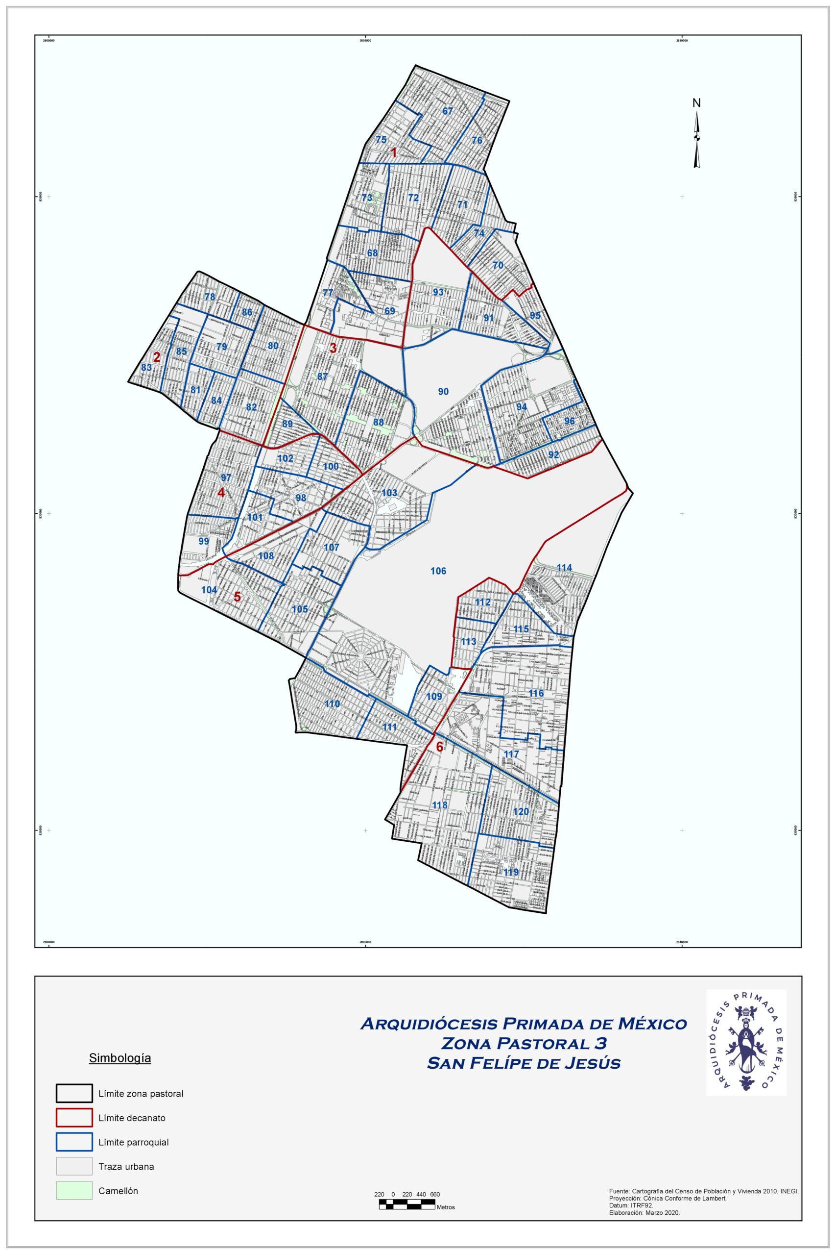 Esta zona pastoral se compone de seis decanatos, en los que están distribuidos 70 templos, de los cuales 9 son rectorías, 7 capillas y 54 parroquias.